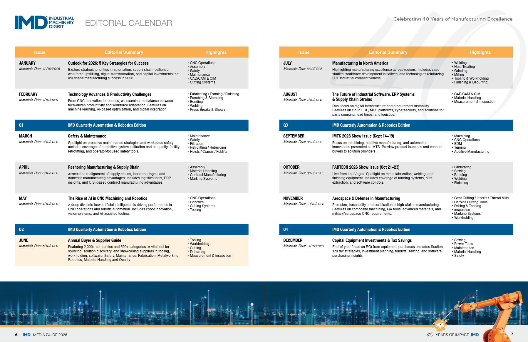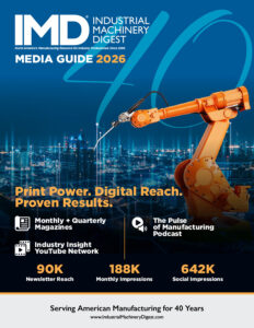 Industrial Machinery Digest (IMD) is the Industry’s Most Extensive Industrial Publication — since 1986. Industrial Machinery Digest | IMD is a monthly trade publication that serves the owners and managers of America’s most diversified job shops, machine shops, OEM/MRO’s, contract manufacturers, and manufacturing plants throughout the United States. This dedicated metalworking and fabricating audience is the driving force behind U.S. Manufacturing.