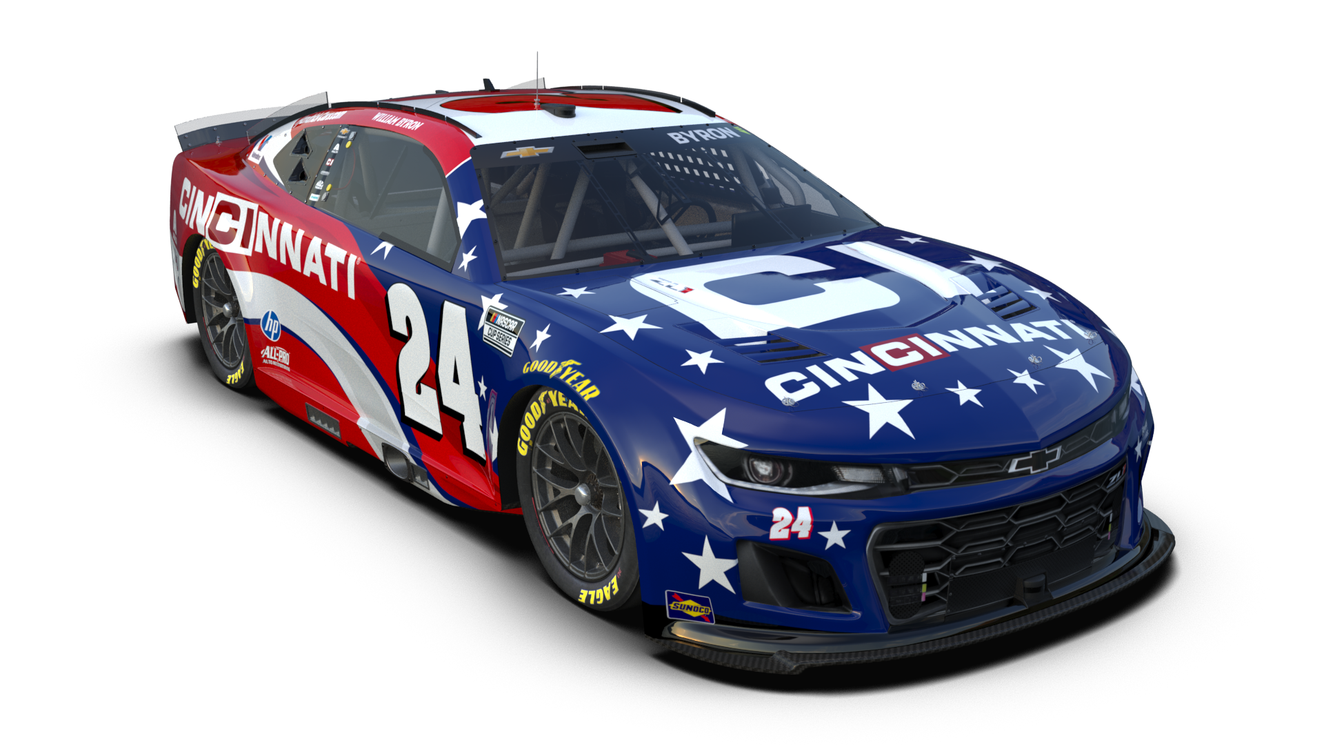 Driven by 2024 DAYTONA 500 champion William Byron, the No. 24 Cincinnati Incorporated Chevrolet will debut a striking new themed design on March 29 at Martinsville Speedway. The patriotic and precision-inspired livery will return to the track under the lights on August 15 at Richmond Raceway.