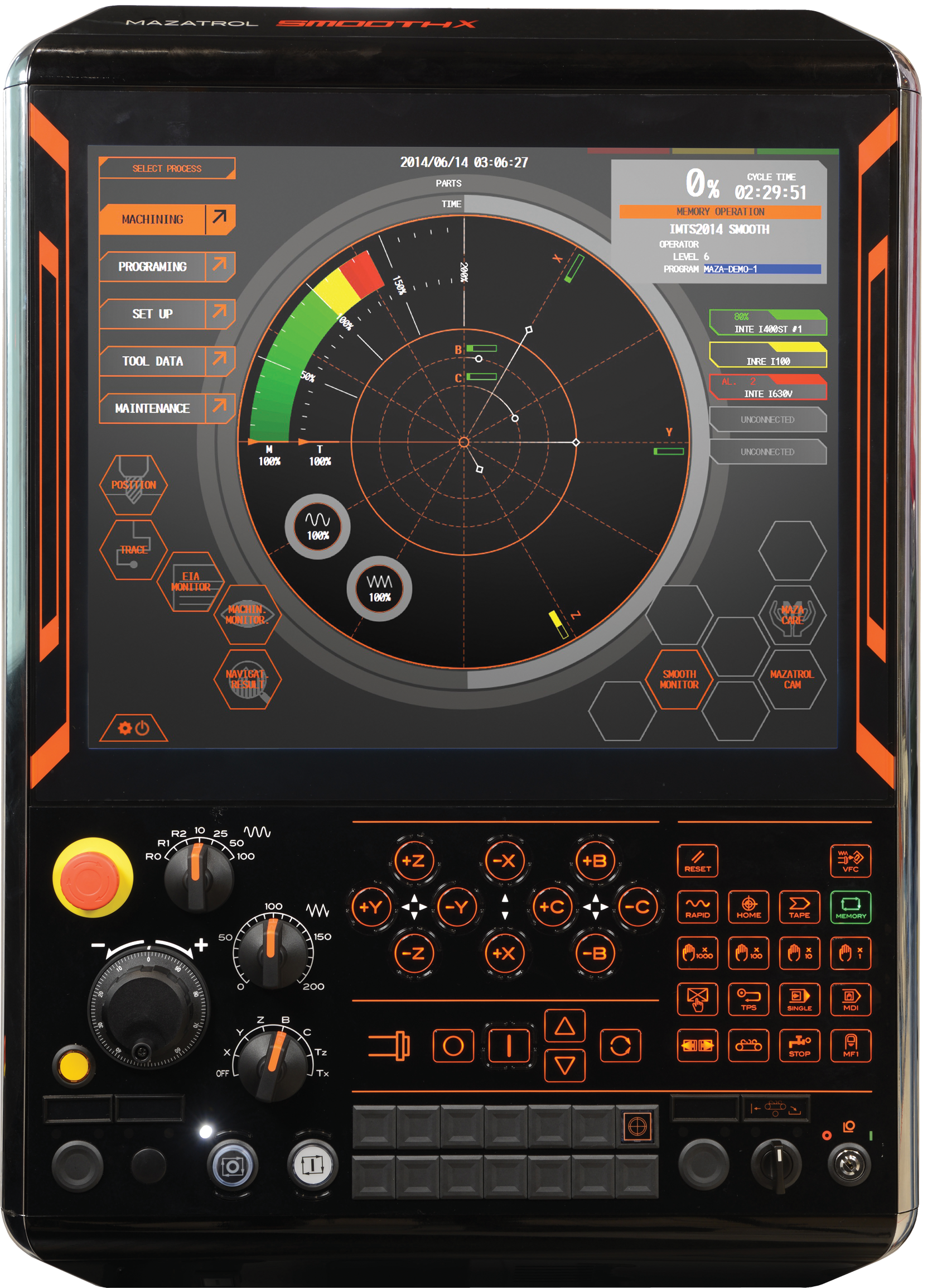 At IMTS 2014, attendees got to experience SMOOTH TECHNOLOGY on the company’s VORTEX i-800V/8, INTEGREX i-100 BARTAC-ST, INTEGREX i-400ST, INTEGREX i-630V/6, INTEGREX e-420H-ST, INTEGREX e-1600V/10S and VARIAXIS i-700T.