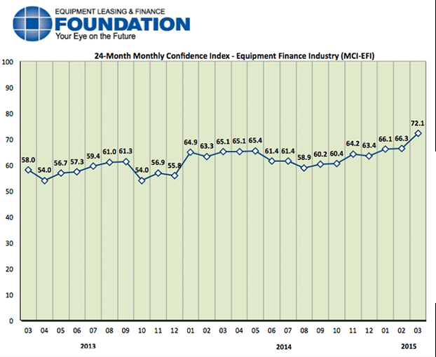 The Equipment Leasing & Finance Foundation (the Foundation) has released the February 2015 Monthly Confidence Index for the Equipment Finance Industry (MCI-EFI). Designed to collect leadership data, the index reports a qualitative assessment of both the prevailing business conditions and expectations for the future as reported by key executives from the $903 billion equipment finance sector. Overall, confidence in the equipment finance market is 66.3, a slight increase from the three-year high level reached by the January index of 66.1.